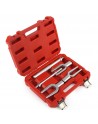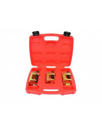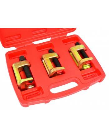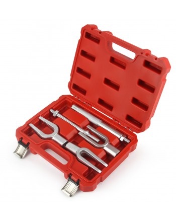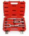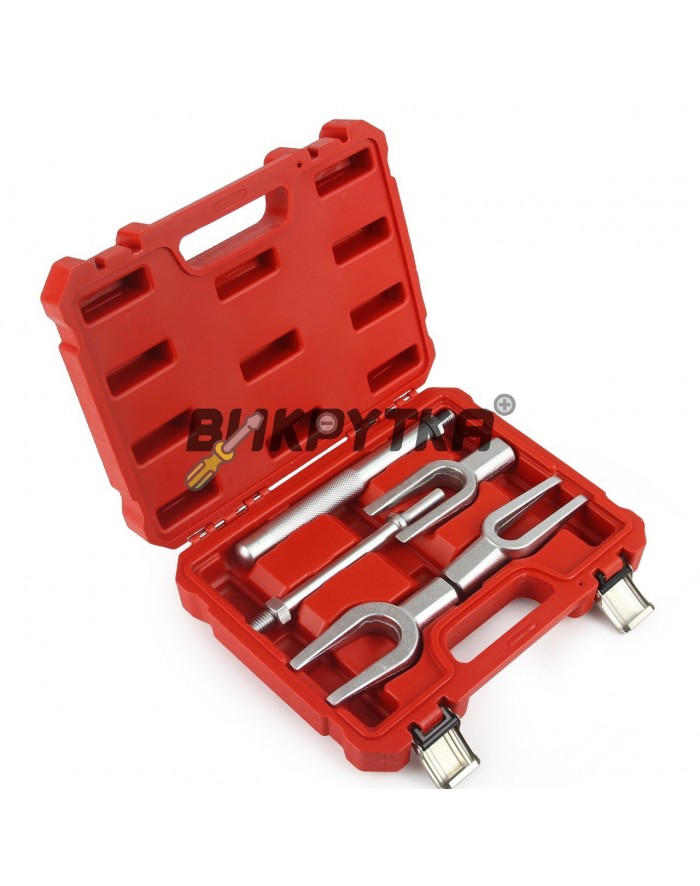 Використовується в професійних автомайстернях для зняття штифтів підвіски та рульових наконечників. Виготовлені з високоякісної сталі, з хромованою поверхнею, вони забезпечують низьке тертя під час роботи та стійкості до ударних навантажень. Кінці вилки мають гладку поверхню, що дозволяє швидко від'єднати наконечник від кермової тяги. Вони полегшують складання та розбирання рульових тяг, а також комплексний ремонт цих вузлів. Набір значно полегшує та скорочує час роботи. У комплект входять дві рукоятки, завдяки яким можна виконувати роботу ручним молотком або відбійним молотком. Придбаний комплект упакований у валізу, що закривається на пластикові клямки, що дозволяє без проблем пересуватися з обладнанням. Комплект призначений для використання у автосервісах. ТЕХНІЧНІ ХАРАКТЕРИСТИКИ